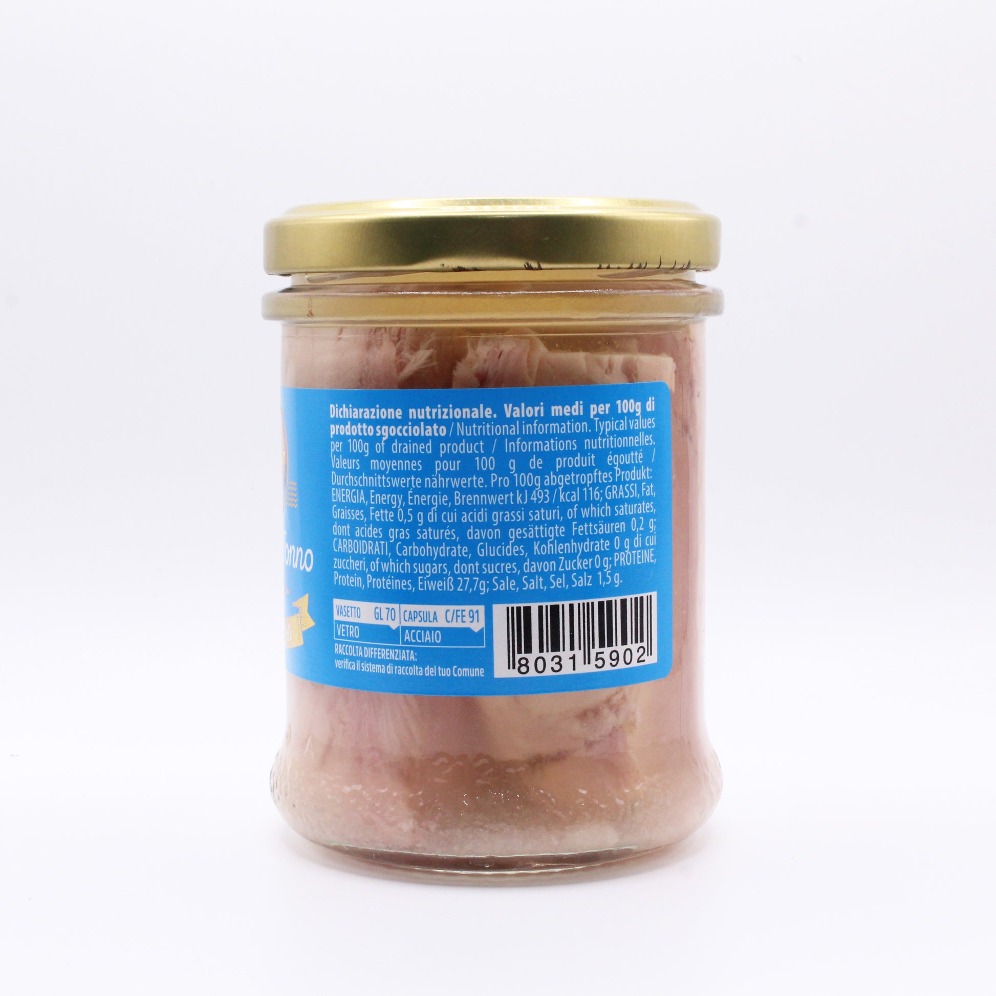 Valori nutrizionali per 100g/ml: Valori medi per 100g di prodotto sgocciolato: Energia 493 kj 116kcal, grassi 0,5g, di cui acidi grassi saturi 0,2g, carboidrati 0g, di cui zuccheri 0g, proteine 27,7g, sale 1,5g
