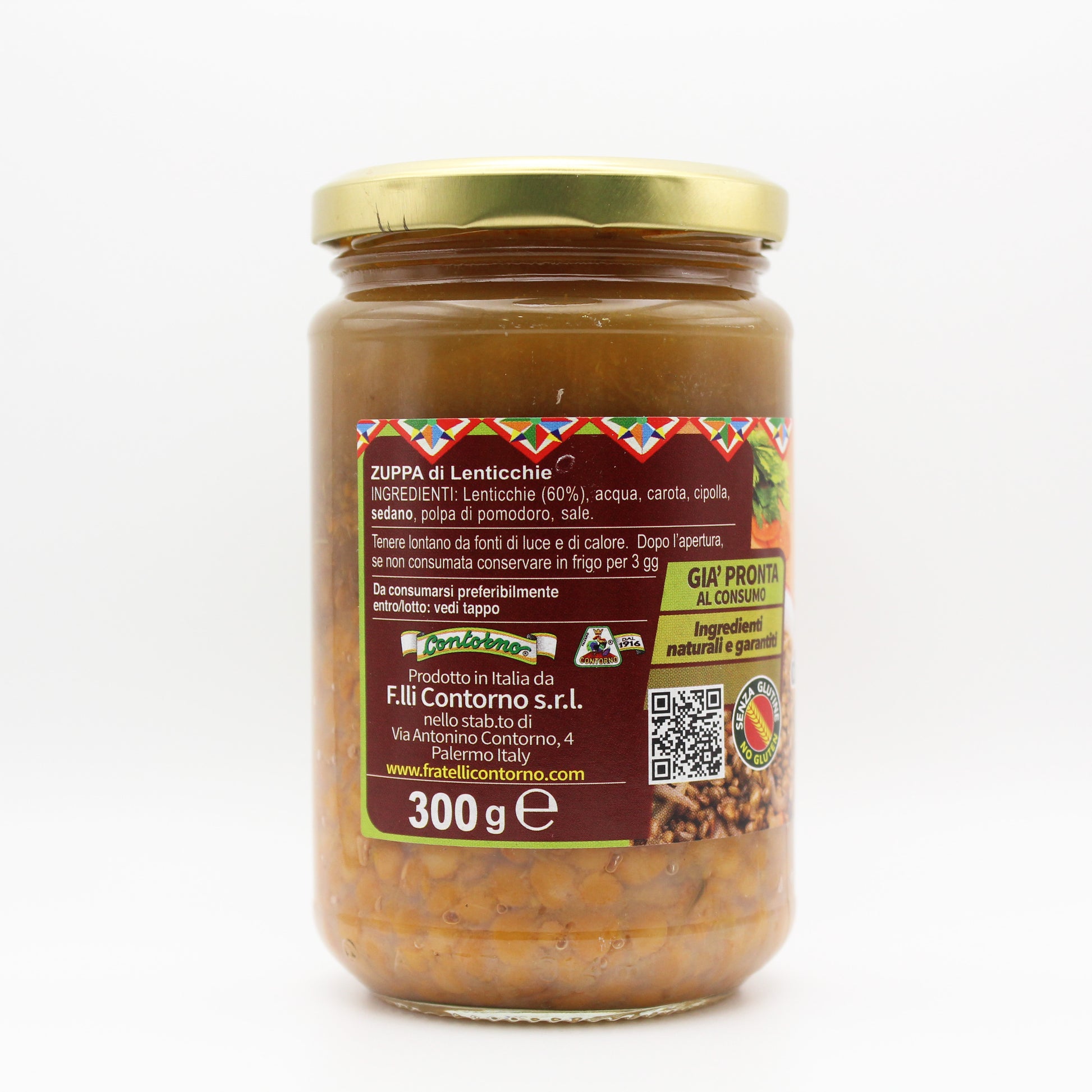Ingredienti: Lenticchie 60%, acqua, cipolla, carota, sedano, polpa di pomodoro, sale.